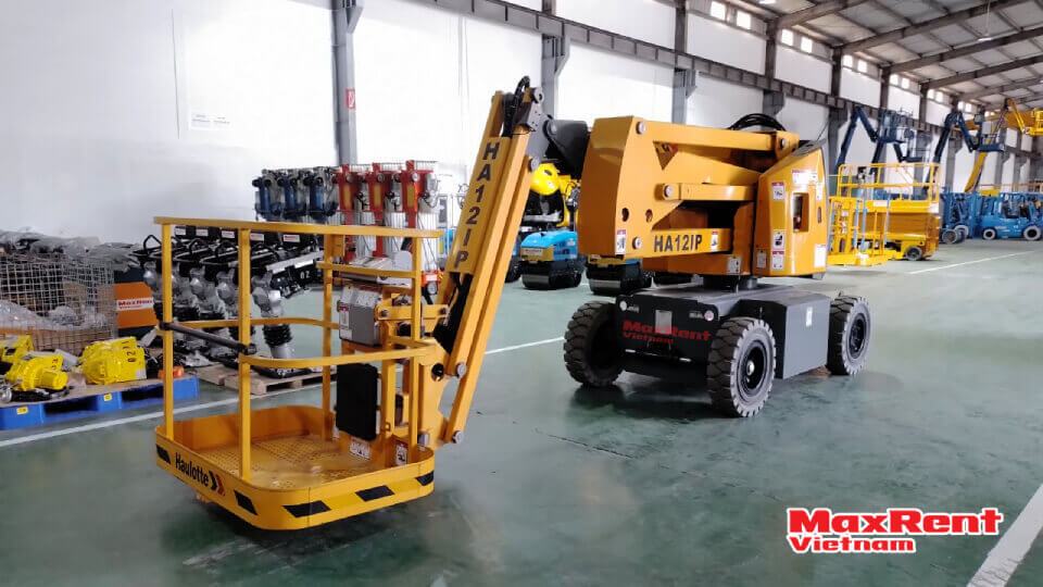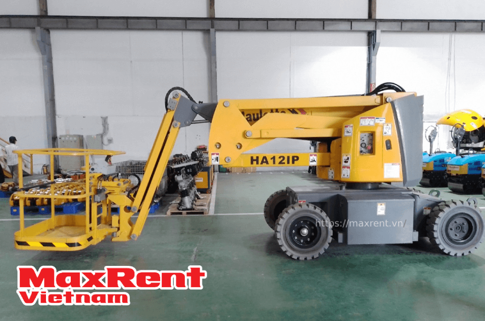 - With a working height of up to 12 meters, the HA12IP boom lift can transport people and materials to high positions in buildings or on the ground. This equipment is equipped with a range of advanced features to improve work efficiency and safety for users.