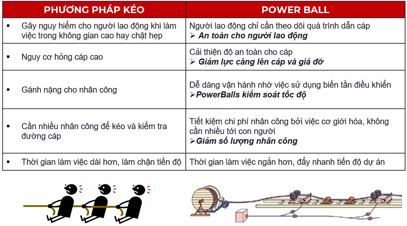 So sánh máy dẫn cáp Power Ball với phương pháp kéo cáp bằng tay truyền thống: